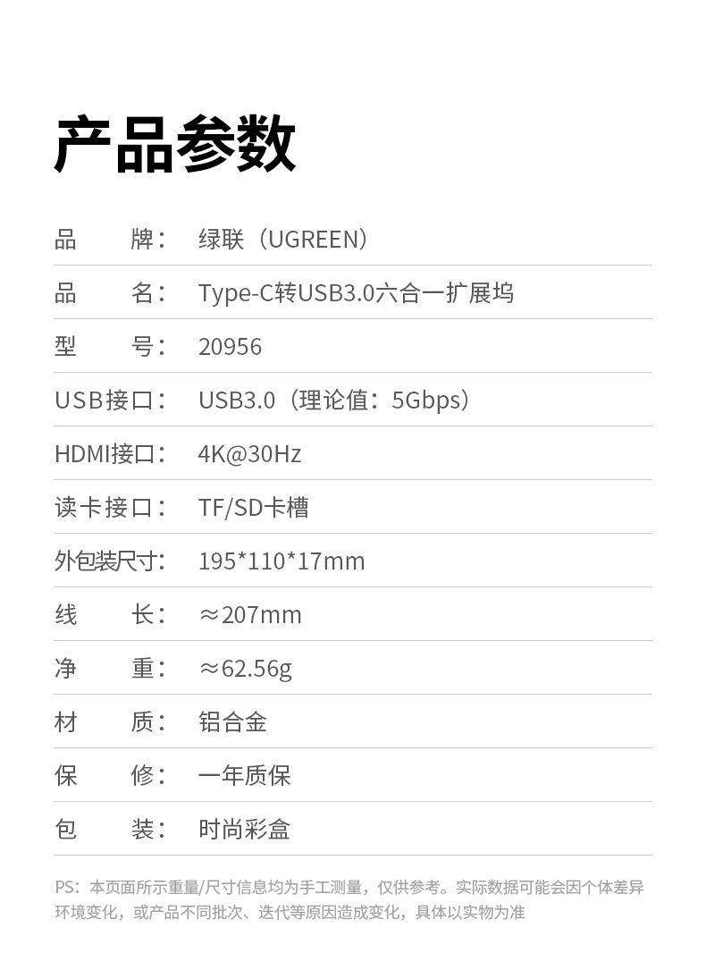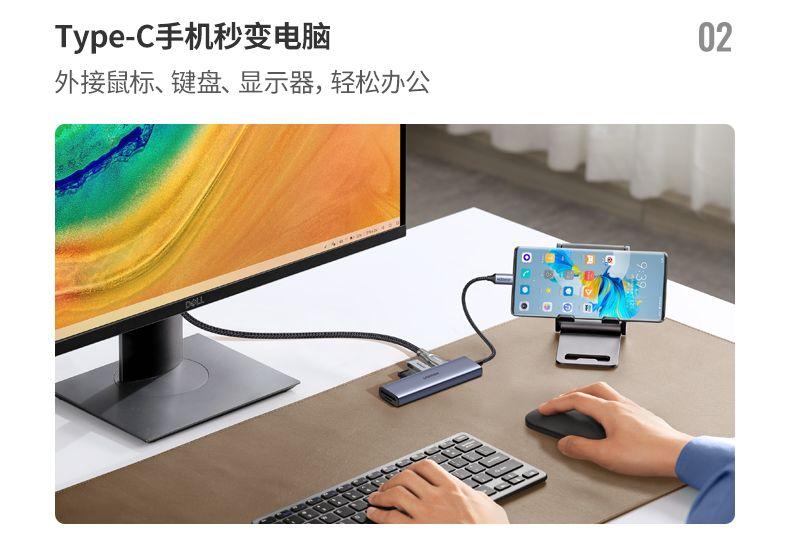 1. Type-C to HDMI+3 ports USB3.0+SD/TF 6-in-1 multi-function docking station/4K30Hz/space gray/ 2. Material: aluminum shell 3. USB specification: USB 3.0, 5Gbps 4. System: Windows/macOS/Linux