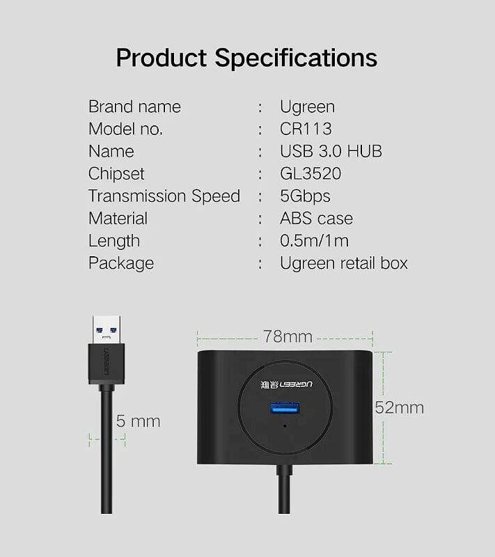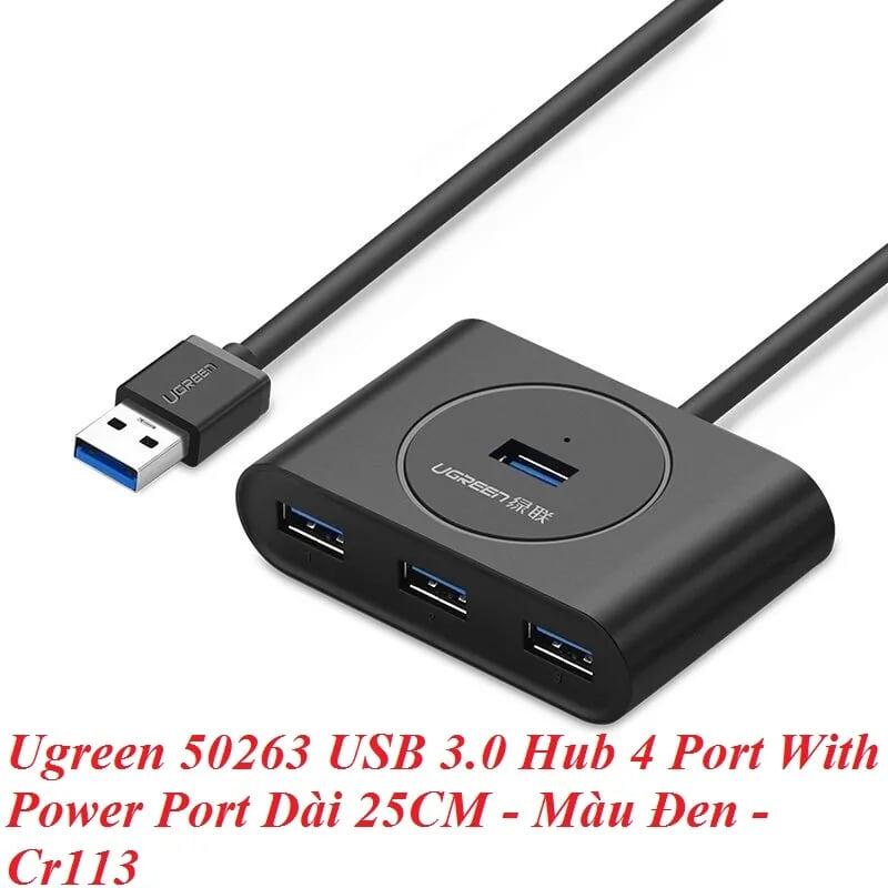 Ugreen 20290 0.5m usb 3.0 hub with powwer port màu đen 50cm cr113 1. Input: USB-A 2. Output : 4 Port USB 3.0 . có cổng usb type c nguồn 5V 3. Color : Black 4. Length