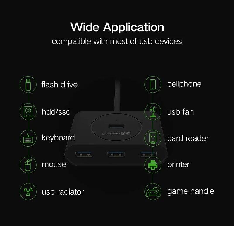 Ugreen 20277 1m 4 ports usb 2.0 hub with micro usb power port màu đen cr106 1. Input : USB-A 2. Output : 4 Port USB 2.0 . 3. Color : Black 4. Length :