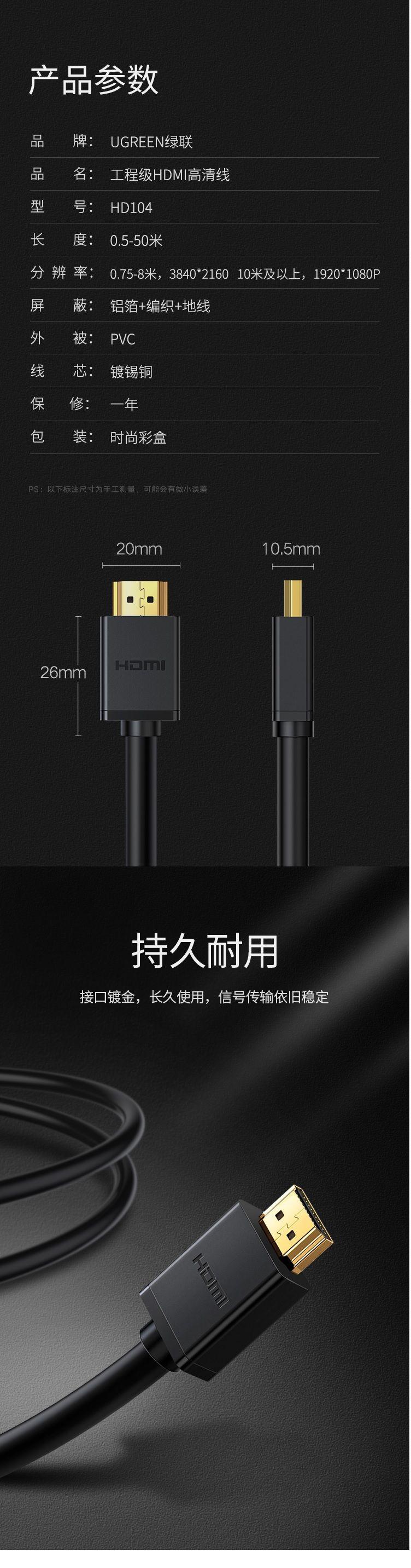Ugreen 10112 20M Hdmi Cable Hd104 1. Standard cable: HDMI 1.4 2. Cable length: 20M 3. Ethernet support - allows sharing data between connected devices without the need for separate Ethernet cables. 4. Connection port: