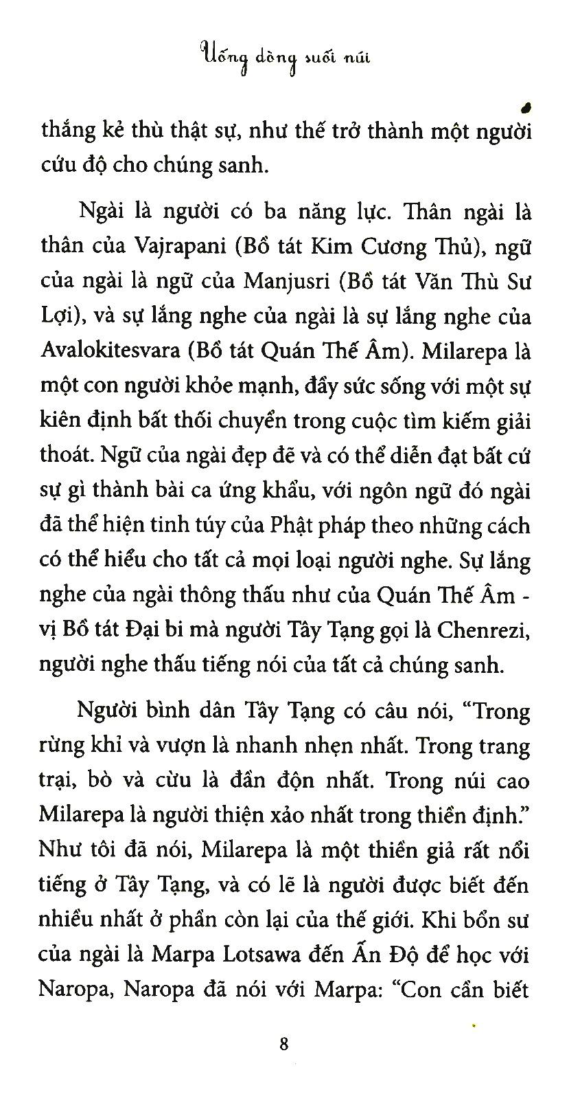 “Milarepa là một trong những đạo sư tâm linh nổi tiếng nhất của mọi thời. Ngài không những là một nhà lãnh đạo kiệt xuất của dòng phái Kagyu, mà cũng là một đạo sư rất quan trọng đối với mọi trường phái của Phật giáo Tây Tạng. Ngài là một ngôi sao của Phật giáo sơ thời Tây Tạng, và là một ngôi sao sáng chói của Thiền, soi sáng con đường Phật pháp ngày nay. Chắc chắn ngài không phải là một người hoang tưởng bỏ xã hội và ẩn tu nơi thâm sơn cùng cốc. Thật ra, ngài là một người phiêu lưu đã đạt đến chót đỉnh của ngọn núi cao với một cái nhìn toàn cuộc về sanh tử. Ngài là một chiến sĩ đích thực đã thành công trong việc chiến thắng kẻ thù thật sự, như thế trở thành một người cứu độ cho chúng sanh.