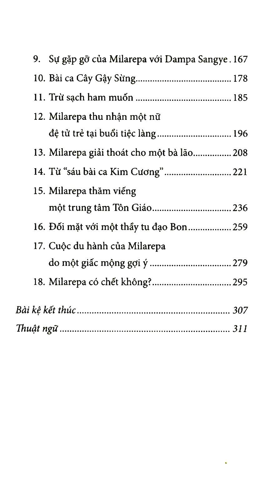 Tôi thành thật mong muốn mọi người đọc những bài ca của Milarepa này sẽ tìm thấy nguồn cảm hứng để thực hành và cuối cùng thực hiện được ý nghĩa chân thật của đời người. Như thế cuốn sách này được hồi hướng cho công trình của Ewam Chošden và cho mọi hành giả ở bất cứ nơi đâu.