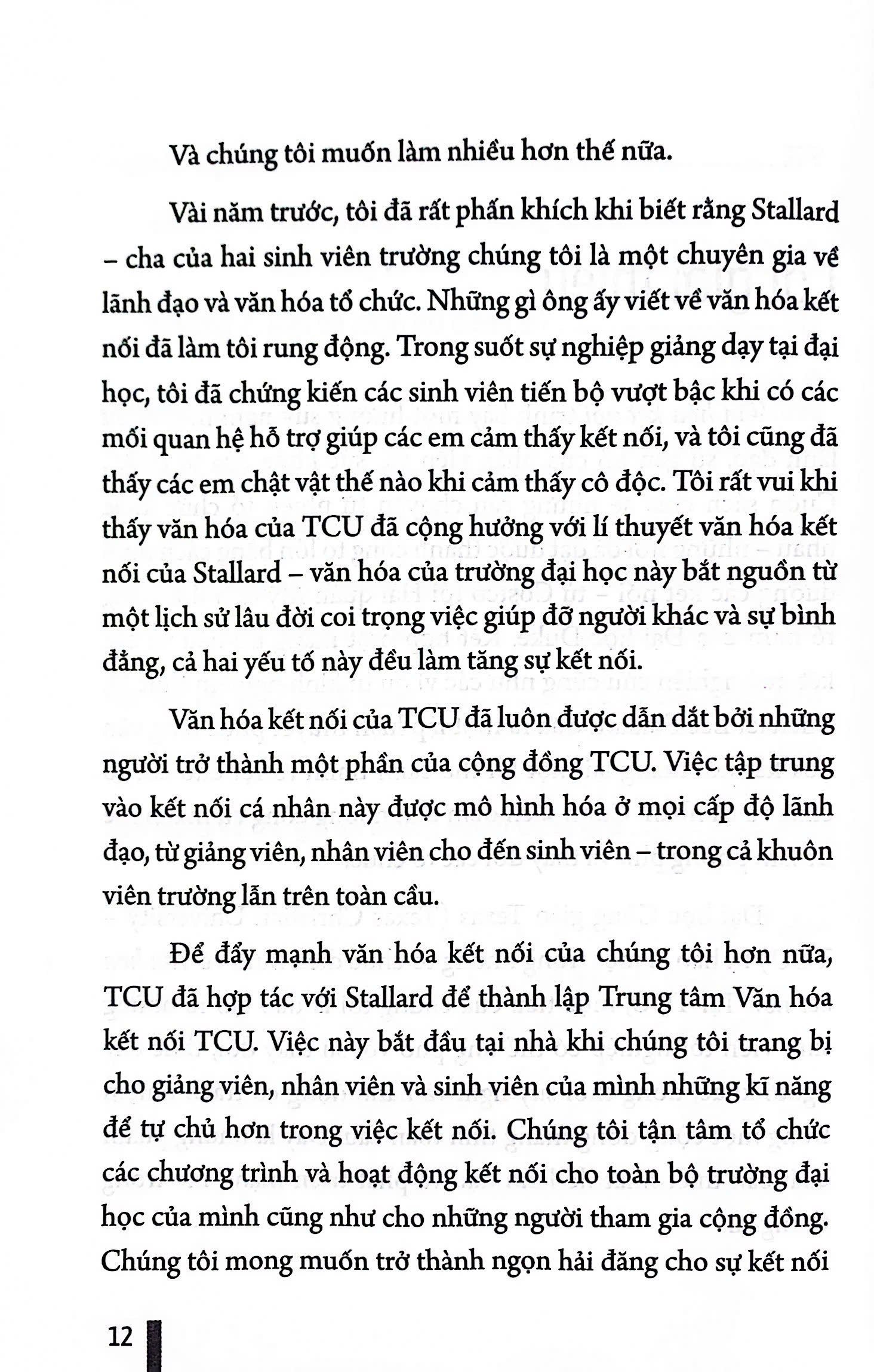 Cuốn sách "Văn hóa kết nối" này chính là cơ hội hiếm có để bạn trở thành một nhà lãnh đạo như vậy. Được xuất bản khi bóng tối của Đại dịch COVID 19 bủa vây, cuốn sách gửi gắm thông điệp về hi vọng tăng trưởng sau chấn thương của tác giả, đồng thời cung cấp những ki thuyết được nghiên cứu kĩ lương và được cập nhập về quan hệ giữa căng thẳng và cô đơn. Ngoài ra, cuốn sách còn trình vày rất nhiều về những nhà lãnh đạo tài ba giao tiếp trong bối cảnh khủng hoảng.