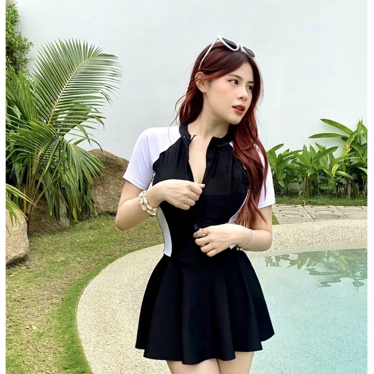 - Mẫu đồ bơi liền thân phong cách năng động tươi mới cho các cô gái trẻ trung. - Dáng cộc tay quần sooc đùi ôm gọn gàng cơ thể, khóa kéo trước tiện dụng