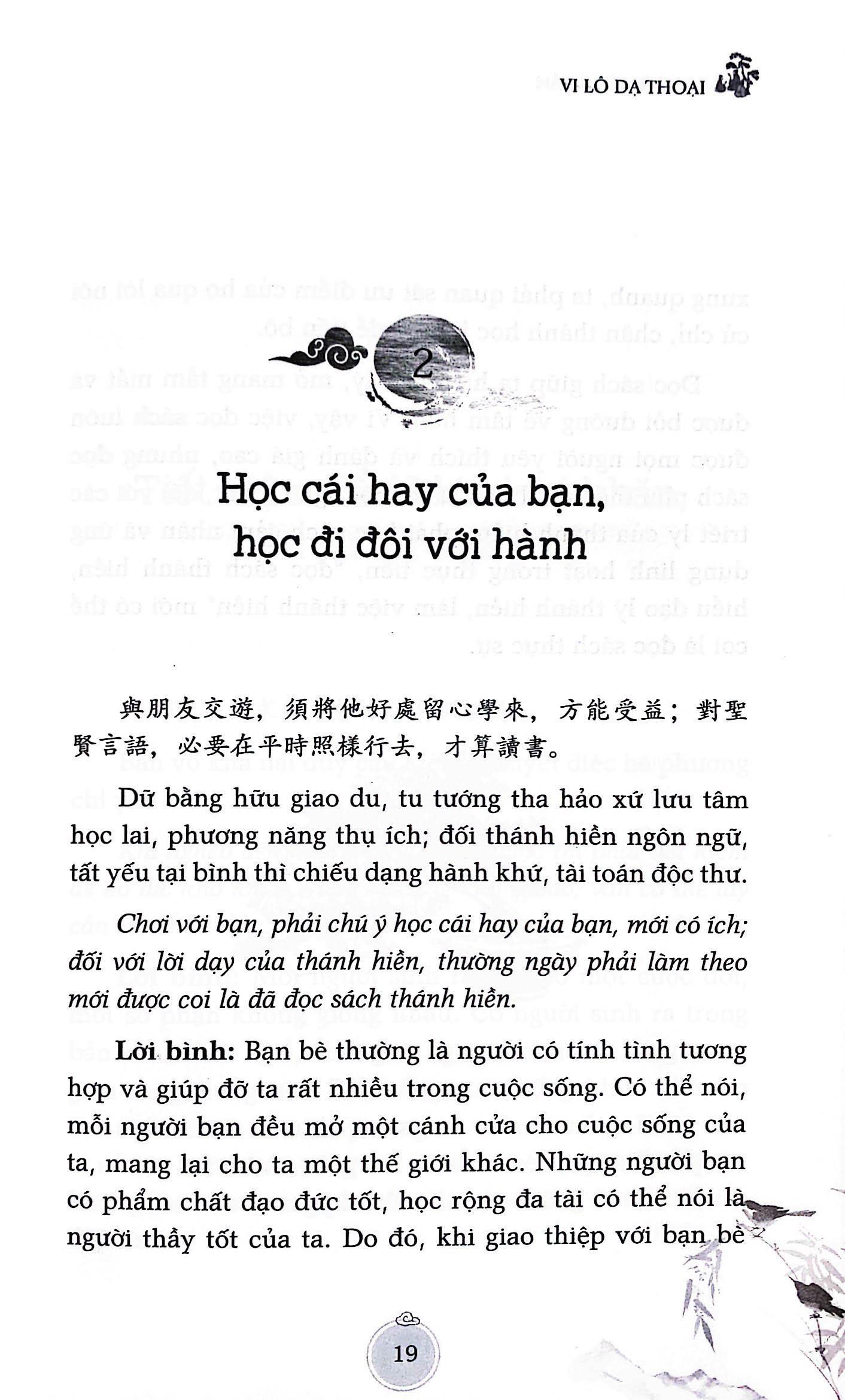 Vi Lô Dạ Thoại Với đề tài “an thân lập nghiệp”, “Vi lô dạ thoại” bàn về tầm quan trọng của “lập đức, lập công, lập ngôn” trong những phương diện như đạo đức, tu thân, học tập, dạy con, trung hiếu, cần kiệm,… thể hiện những suy nghĩ sâu sắc của tác giả về giá trị nhân sinh. Là tác phẩm kinh điển ngắn gọn, tinh tế và giàu triết lý tu thân dưỡng tính, làm người và đối nhân xử thế, những câu văn giản dị, hồn hậu mà thấm đẫm triết lý sẽ tiếp thêm cho bạn nhiều tinh hoa trí tuệ của cổ nhân, tránh xa những mơ hồ bối rối của nhân sinh, và đạt được sự thấu tỏ, sáng suốt trong nội tâm.