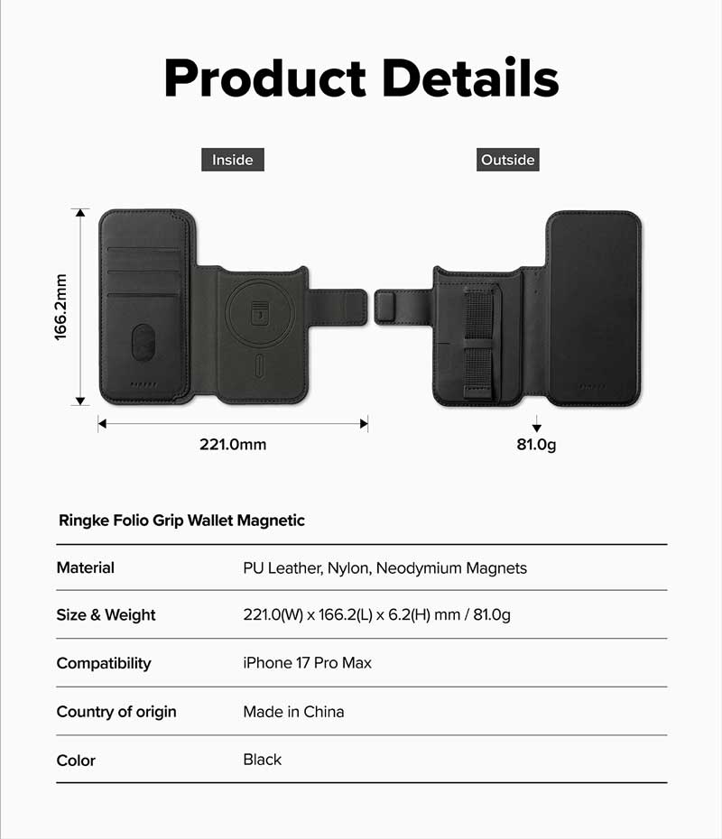 - Ringke Folio Grip Wallet Magnetic là sản phẩm tích hợp 2 tính năng trong một: ví đựng thẻ kiêm giá đỡ và cần được dùng chung với ốp lưng Magnetic dành riêng cho dòng máy iPhone 17 Pro Max.