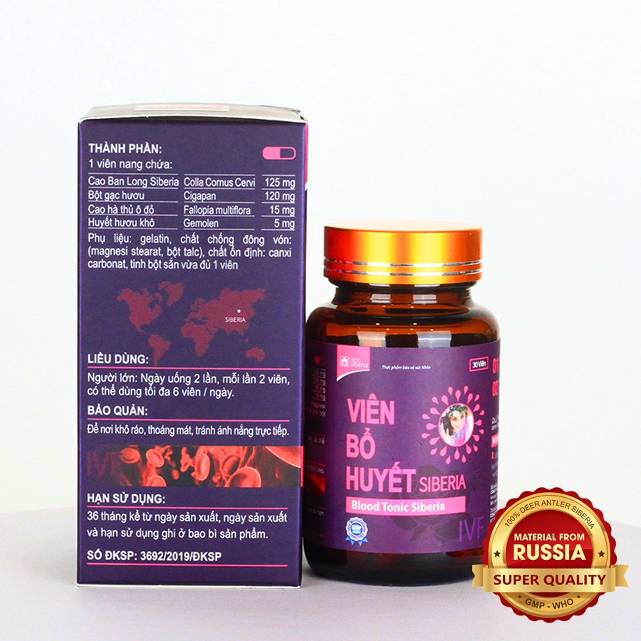 VIÊN BỔ HUYẾT SIBERIA – Blood Tonic Siberia Hộp 30 Viên là sản phẩm bồi bổ sức khỏe dạng viên nang, tiện dụng được bào chế bằng công nghệ mới từ những thành phần dược liệu thiên nhiên quý hiếm như Cao ban long, Huyết hươu khô, Bột gạc hươu, Cao hà thủ ô đỏ,… giúp tăng cường sức khỏe cho người dùng. Không chỉ được chiết xuất từ những nguồn dược liệu thiên nhiên quý giá, Viên Bổ Huyết Siberia Siberia còn được tinh chiết bằng công nghệ kỹ thuật hiện đại hàng đầu của Công ty Cổ phần Hóa dược Việt Nam và sự kiểm định chất lượng chặt chẽ từ các chuyên gia Nga của Eco Siberia (Ltd), giúp chuyên biệt hóa công dụng của sản phẩm tốt cho người dùng. CÔNG DỤNG CHUYÊN BIỆT CỦA VIÊN BỔ HUYẾT SIBERIA Giúp bổ huyết, hỗ trợ điều hòa khí huyết ổn định Hỗ trợ tăng cường sức khỏe, cơ thể suy yếu mệt mỏi. Hỗ trợ khả năng hấp thụ dinh dưỡng cho cơ thể, giúp ăn ngon, ngủ tốt. THÀNH PHẦN VIÊN BỔ HUYẾT SIBERIA: Cao Ban Long Siberia (Colla Cornus Cervi) 125 mg Bột Gạc Hươu Non (Cigapan) 120 mg Cao Hà Thủ Ô Đỏ (Fallopia multiflora) 15 mg Huyết Nhung Hươu Khô (Gemolen) 5mg ĐỐI TƯỢNG DÙNG VIÊN BỔ HUYẾT SIBERIA Thích hợp dùng cho người cao tuổi, cơ thể suy nhược. Người gầy yếu hay mệt mỏi, chán ăn, mất ngủ. HƯỚNG DẪN SỬ DỤNG: Ngày uống 2 lần, mỗi lần 2 viên. Dùng tối đa là 6 viên trong một ngày. Dùng sau khi ăn 30 phút với nước sôi để nguội. Nên dùng sản phẩm thường xuyên kết hợp với uống nhiều nước để phát huy tốt nhất công dụng của sản phẩm. Hiệu quả cao khi sử dụng 1 liệu trình 3 hộp. BẢO QUẢN: Nơi khô ráo, thoáng mát, tránh ánh sáng, nhiệt độ dưới 30 độ C. Lưu ý: Sản phẩm này KHÔNG phải là thuốc và và không có tác dụng thay thế thuốc chữa bệnh. Không dùng cho người mẫn cảm với bất cứ thành phần nào của sản phẩm.