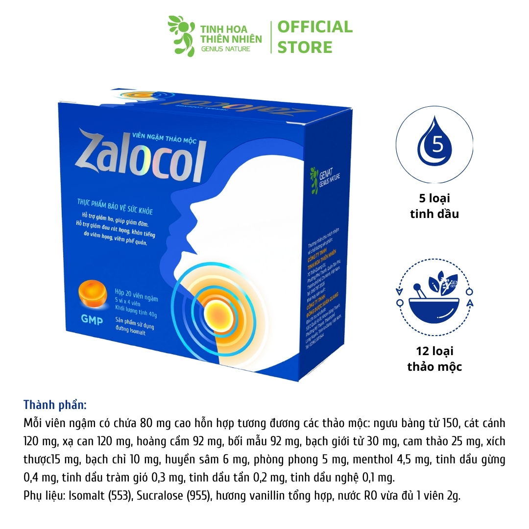 TPBVSK Viên ngậm thảo mộc Zalocol Hỗ trợ giảm ho, giảm đờm, giảm đau rát họng, khản tiếng - Genat Thành phần: Mỗi viên ngậm có chứa 80 mg cao hỗn hợp tương đương các thảo mộc: ngưu bàng tử 150, cát cánh 120 mg, xạ can 120 mg, hoàng cầm 92 mg, bối mẫu 92 mg, bạch giới tử 30 mg, cam thảo 25 mg, xích thược15 mg, bạch chỉ 10 mg, huyền sâm 6 mg, tế tân 5 mg, phòng phong 5 mg, menthol 4,5 mg, tinh dầu gừng 0,4 mg, tinh dầu tràm gió 0,3 mg, tinh dầu tần 0,2 mg, tinh dầu nghệ 0,1 mg. Phụ liệu: Isomalt (553), Sucralose (955), hương vanillin tổng hợp, nước RO vừa đủ 1 viên 2g. Công dụng: Hỗ trợ giảm ho, giúp giảm đờm, giảm đau rát họng, khản tiếng do viêm họng, viêm phế quản. Đối tượng sử dụng: Người lớn và trẻ em bị ho, đau rát họng, khản tiếng do viêm họng, viêm phế quản. Cách dùng: Người lớn: ngậm mỗi lần 1-2 viên, ngày 5-6 lần. Trẻ em trên 6 tuổi: mỗi lần ngậm 1 viên, ngày 5-6 lần. Lưu ý: Không dùng cho người mẫn cảm, kiêng kỵ với bất cứ thành phần nào của sản phẩm. Sản phẩm có thể dùng cho người bị tiểu đường Để xa tầm tay trẻ em Bảo quản: Nơi khô ráo, sạch sẽ, tránh làm rách bao bì Hạn sử dụng: 36 tháng kể từ ngày sản xuất Số ĐKSP: 9303/2021/ĐKSP "Thực phẩm này không phải là thuốc, không có tác dụng thay thế thuốc chữa bệnh" Sản phẩm của CÔNG TY TNHH TINH HOA THIÊN NHIÊN Xuất xứ: Việt Nam