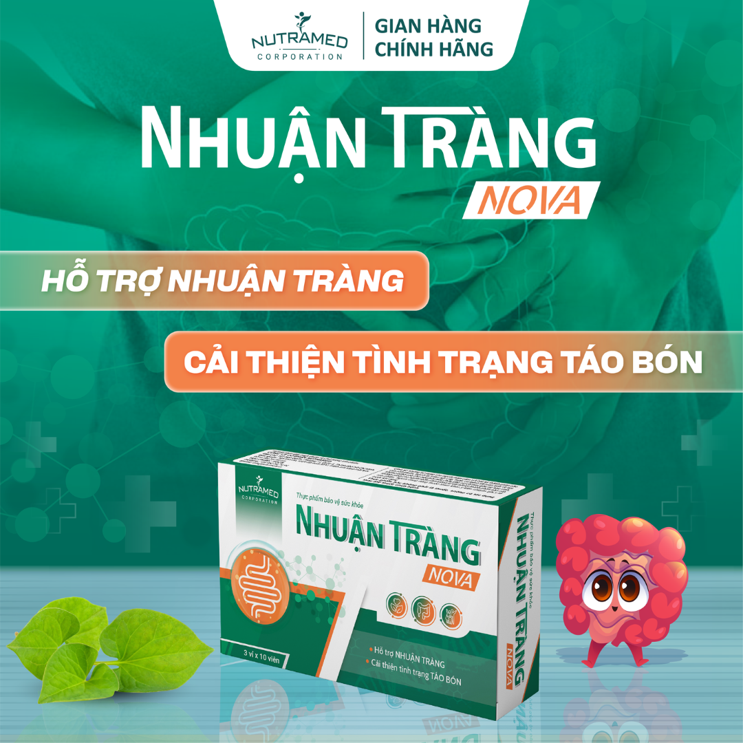 NHUẬN TRÀNG NO.VA - Hỗ trợ nhuận tràng, cải thiện tình trạng táo bón THÀNH PHẦN  ️  Phan tả diệp (Cassia angustifolia Vahl), Thảo quyết minh (Cassia tora L.) , Ngư tinh thảo (Houttuynia cordata), Chỉ xác (Citrus sp.), Inulin.   CÔNG DỤNG    ️Hỗ trợ nhuận tràng, cải thiện tình trạng táo bón   ĐỐI TƯỢNG SỬ DỤNG  ️ Trẻ em từ 6 tuổi trở lên và người lớn bị táo bón   HƯỚNG DẪN SỬ DỤNG  ️  Trẻ từ 6 tuổi trở lên : Uống 1 viên/lần x 2 lần/ngày  ️  Người lớn: Uống 1 viên/lần x 2-3 lần/ngày   KHÔNG SỬ DỤNG TRONG TRƯỜNG HỢP ️ Phụ nữ có thai, phụ nữ sau sinh ️   Người bị tiêu chảy ️   Người mẫn cảm, kiêng kỵ với bất kỳ thành phần nào của sản phẩm   LƯU Ý ️  Thực phẩm này không phải là thuốc, không có tác dụng thay thế thuốc chữa bệnh. ️   Người đang dùng thuốc tham khảo ý kiến chuyên gia y tế trước khi dùng   BẢO QUẢN   ️  Nơi khô mát, tránh ánh nắng mặt trời. Nhiệt độ dưới 30°C. Tránh xa tầm tay trẻ em.   THÔNG TIN SẢN PHẨM Tên sản phẩm: NHUẬN TRÀNG NO.VA Quy cách đóng gói: Hộp 3 vỉ x 10 viên. Hạn sử dụng: 36 tháng Tiêu chuẩn: TCCS   _ NUTRAMED - KHƠI NGUỒN KHOA HỌC TỚI CUỘC SỐNG   Nhà máy đạt chuẩn WHO – GMP. Nguyên liệu được kiểm tra chất lượng khắt khe bởi nhà máy đạt chuẩn GMP.