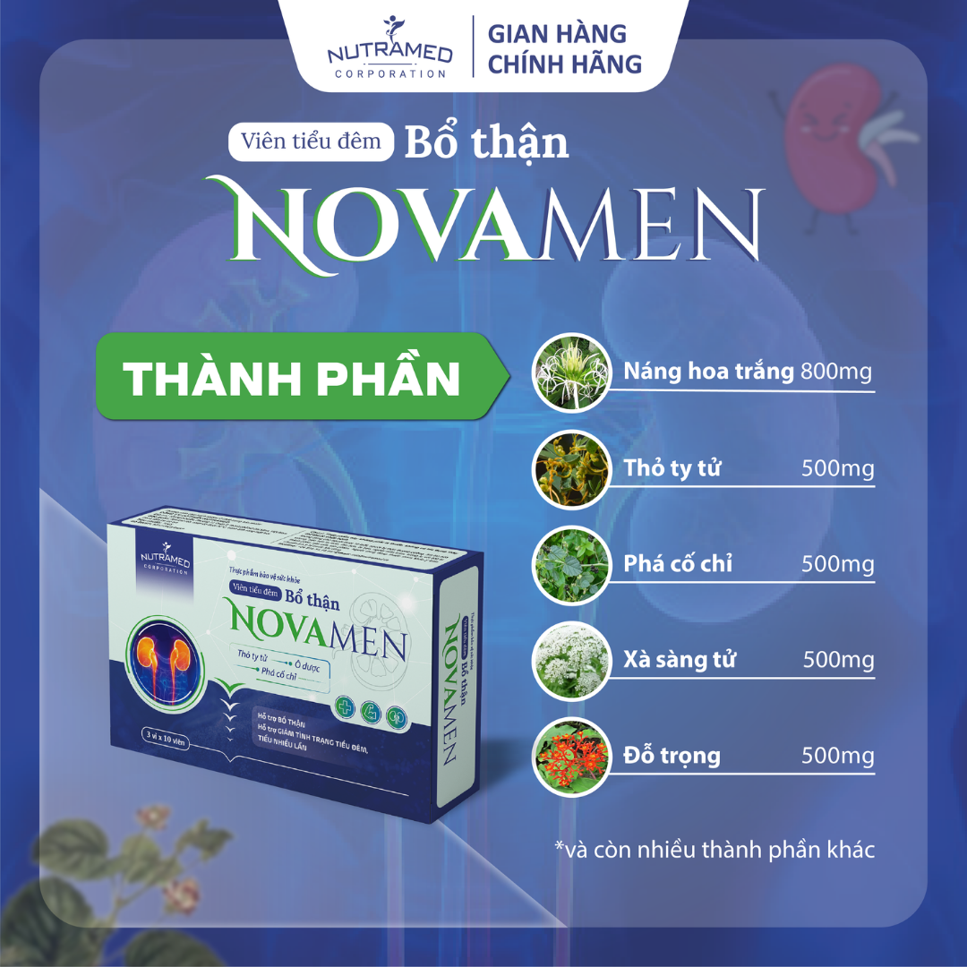 Viên t.i.ể.u đ.ê.m bổ thận NOVAMEN  - Giải pháp hỗ trợ bổ thận, giảm tiểu đêm   THÀNH PHẦN  ️ Nắng hoa trắng (Crinum asiaticum L.); Thỏ ty tử (Cuscuta chinensis Lamk); Phá cố chỉ (Psoralea corylifolia L.); Xà sàng tử (Cnidium monnieri); Đỗ trọng (Eucommia ulmoides Oliv); Ô dược (Lindera myrrha); Lạc tiên (Herba Passiflorae foetidae); Bình vôi (Stephania glabra); Tiểu hồi hương (Foeniculum vulgare Mill)   CÔNG DỤNG    ️  Hỗ trợ bổ thận, hỗ trợ giảm tình trạng tiểu đêm, tiểu đêm nhiều lần.     ĐỐI TƯỢNG SỬ DỤNG  ️  Người lớn thận kém, có triệu chứng tiểu đêm, tiểu nhiều lần.   HƯỚNG DẪN SỬ DỤNG  ️  Người lớn: uống 2 viên/lần x 1 – 2 lần/ngày, uống sau bữa ăn.   KHÔNG SỬ DỤNG TRONG TRƯỜNG HỢP  ️  Người dưới 18 tuổi.  ️  Người bị thận dương cường, âm hư hỏa vượng, tiểu tiện ra máu, táo bón, bí tiểu.  ️  Người mẫn cảm, kiêng kỵ với bất kỳ thành phần nào của sản phẩm.   LƯU Ý  ️  Thực phẩm này không phải là thuốc, không có tác dụng thay thế thuốc chữa bệnh.  ️  Người đang dùng thuốc tham khảo ý kiến chuyên gia y tế trước khi dùng.   BẢO QUẢN   ️  Nơi khô ráo, nhiệt độ dưới 30°C, tránh ánh sáng mặt trời.  ️  Để xa tầm tay trẻ em.   THÔNG TIN SẢN PHẨM Tên sản phẩm: Viên t.i.ể.u đ.ê.m bổ thận NOVAMEN Quy cách: Hộp 3 vỉ x 10 viên. Hạn sử dụng: 36 tháng kể từ ngày sản xuất. Tiêu chuẩn: TCCS _ NUTRAMED - KHƠI NGUỒN KHOA HỌC TỚI CUỘC SỐNG   Nhà máy đạt chuẩn WHO – GMP. Nguyên liệu được kiểm tra chất lượng khắt khe bởi nhà máy đạt chuẩn GMP.
