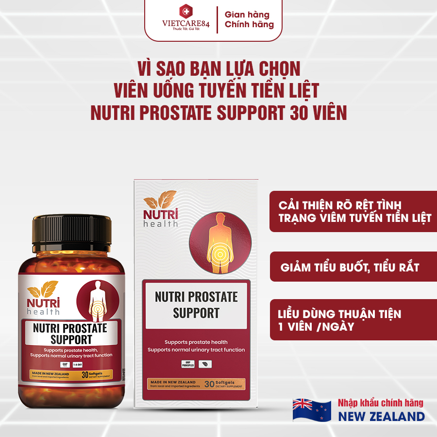 Tuyến tiền liệt – “trạm kiểm soát” quan trọng trong sinh sản nam giới – bắt đầu có dấu hiệu suy yếu sau tuổi 25. Sự thay đổi nội tiết và tác động từ môi trường sống có thể khiến tuyến tiền liệt dễ viêm, phì đại, dẫn đến loạt triệu chứng gây khó chịu như tiểu đêm, tiểu buốt, tiểu rắt... Nếu không được chăm sóc và can thiệp kịp thời, tình trạng này không chỉ ảnh hưởng đến sức khỏe tổng thể mà còn làm suy giảm chất lượng cuộc sống, đặc biệt là đời sống vợ chồng.   Thực phẩm bảo vệ sức khỏe Viên Uống Hỗ Trợ Tuyến Tiền Liệt NUTRI PROSTATE SUPPORT 30 Viên     Viên uống tiền liệt tuyến Nutri Prostate Support hỗ trợ sức khỏe tuyến tiền liệt nhờ chiết xuất cây cọ lùn, cây tầm ma và kẽm oxide. Sản phẩm dùng tiện lợi chỉ 1 viên mỗi ngày. Nutri Prostate Support là sản phẩm chất lượng cao từ Nutri Health, nhập khẩu chính hãng từ New Zealand.     THÀNH PHẦN: mỗi viên nang mềm có chứa: Chiết xuất cây cọ lùn: 320mg, tương đương 3200mg khô Chiết xuất cây tầm ma: 240mg, tương đương 2400mg khô Kẽm Oxide: 12,76mg, tương đương Kẽm: 10mg Phụ liệu: Chất nhũ hoá (Glyceryl monostearate, lecithin (322(i)), dầu đậu nành (479)), vỏ nang (gelathin), chất làm ẩm (glycerin (422)), nước tinh khiết, màu thực phẩm tổng hợp (oxit sắt đen (172(i)), oxit sắt đỏ (172 (ii)).    CÔNG DỤNG: Hỗ trợ sức khoẻ tuyến tiền liệt   ĐỐI TƯỢNG SỬ DỤNG:  Nam giới tuổi trưởng thành      CÁCH DÙNG: Uống 1 viên mỗi ngày với bữa ăn hoặc theo chỉ dẫn của chuyên gia y tế.