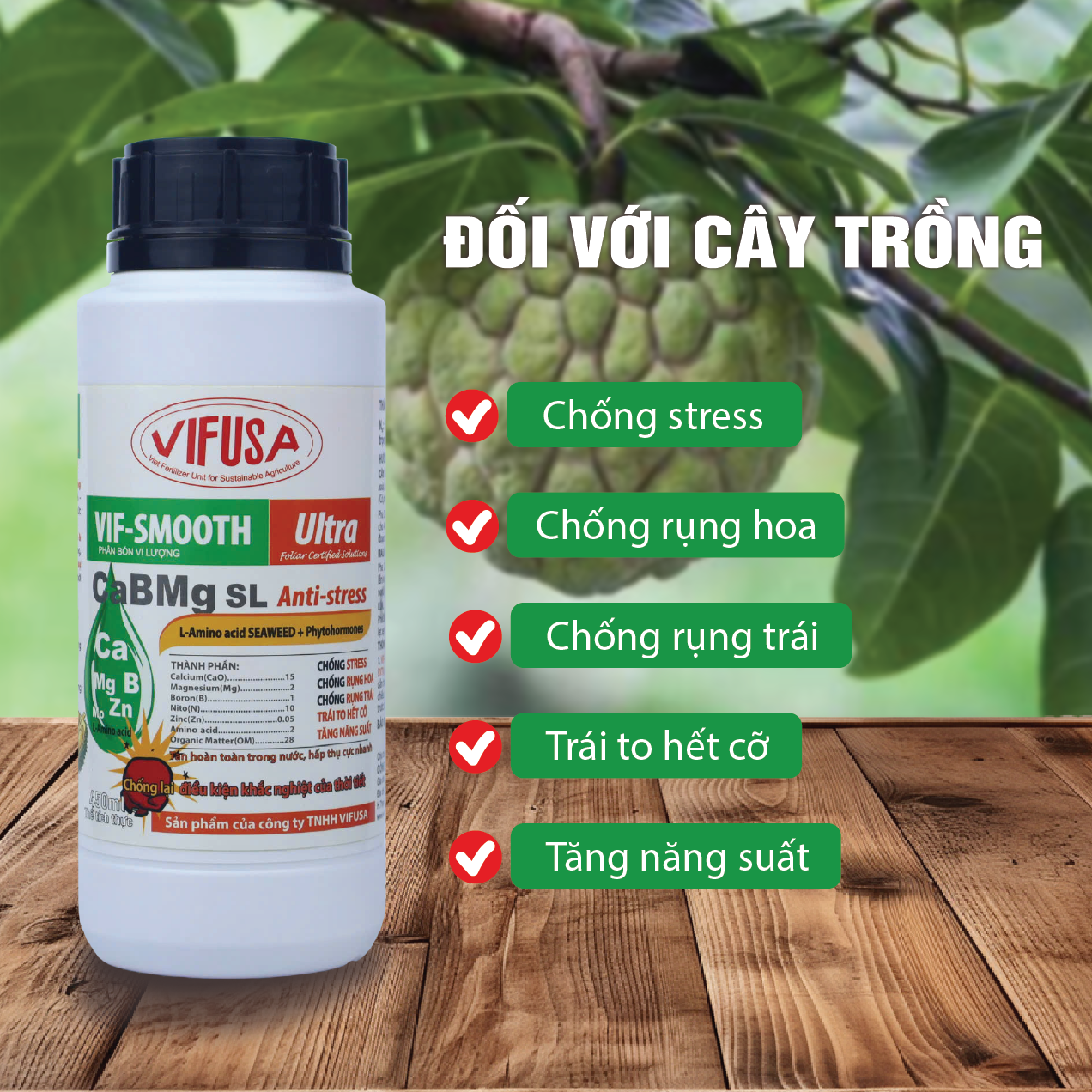 VIF-SMOOTH Ultra là sản phẩm phân bón dạng lỏng hòa tan, nồng độ cao trung vi lượng Canxi (CaO) 15% - Boron (B) 1% - Magie (Mg) 2% - Kẽm (Zn) 0.05% dạng phức hợp hữu cơ, đáp ứng dinh dưỡng giai đoạn nuôi trái.