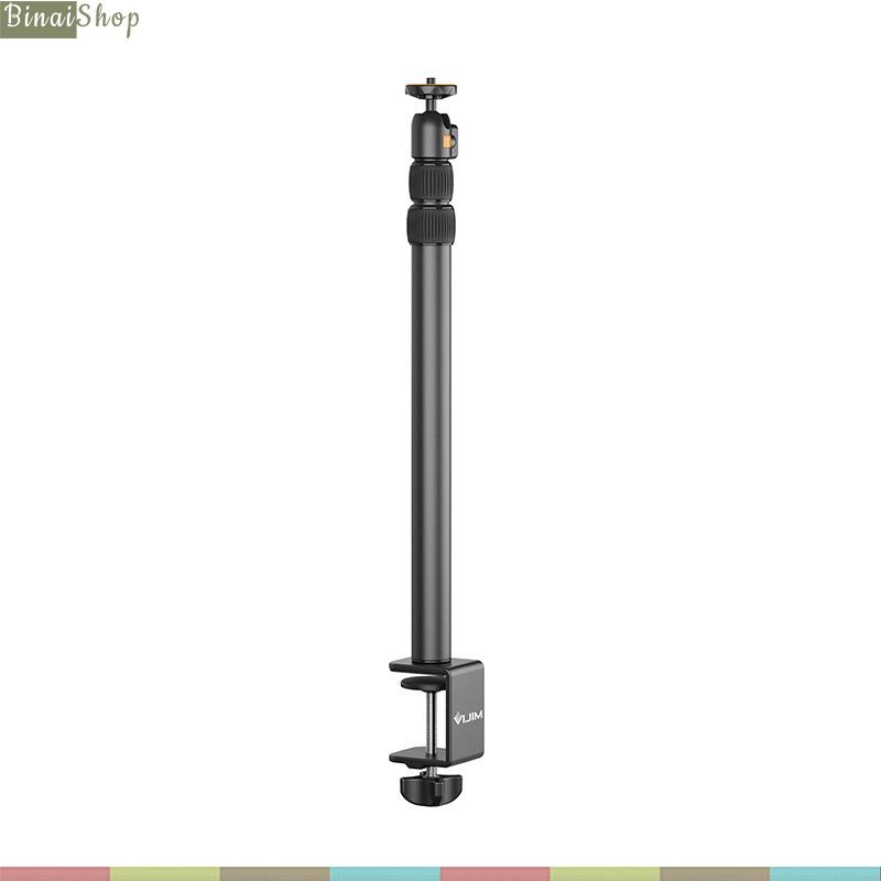 - Thanh chính có 3 mức chiều cao, tối đa là 105cm, phần kẹp mở rộng tối đa 8cm, tương thích hầu hết các mặt bàn phổ thông hiện nay, ball head xoay 360 độ, có thể tháo rời.