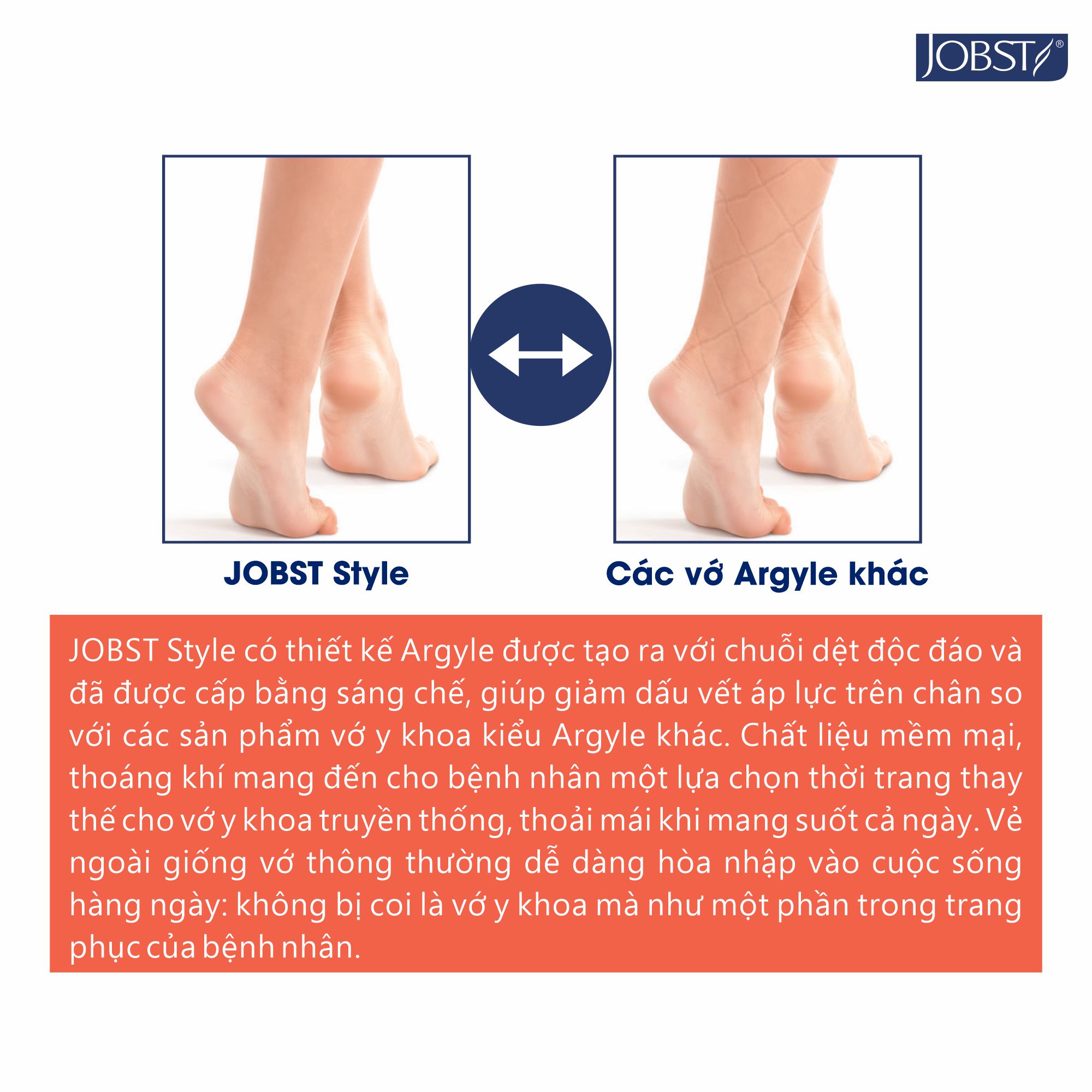 - JOBST Style có thiết kế Argyle được tạo ra với chuỗi dệt độc đáo và đã được cấp bằng sáng chế, giúp giảm dấu vết áp lực trên chân so với các sản phẩm tất nén kiểu Argyle khác. Chất liệu mềm mại, thoáng khí mang đến cho bệnh nhân một lựa chọn thời trang thay thế cho vớ nén truyền thống, thoải mái khi mang suốt cả ngày. Vẻ ngoài giống vớ thông thường dễ dàng hòa nhập vào cuộc sống hàng ngày: không bị coi là vớ nén mà như một phần trong trang phục của bệnh nhân. ĐẶC TÍNH SẢN PHẨM
