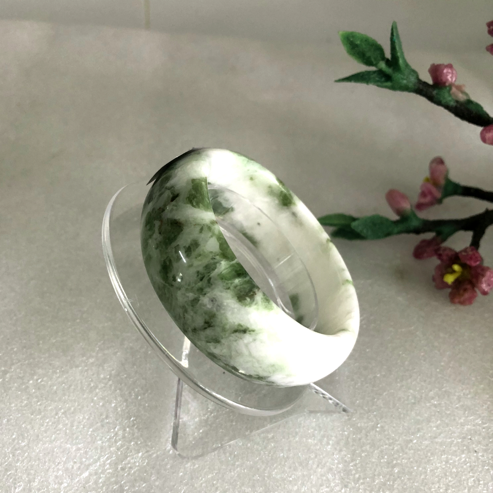 1.Chất: Đá ngọc Serpentine xanh lá nhạt 100% đá tự nhiên khai thác và chế tác tại Việt Nam, màu sắc đẹp y như hình 2. Kích thước: Chiều cao của vòng là 2.5-2.9 cm.