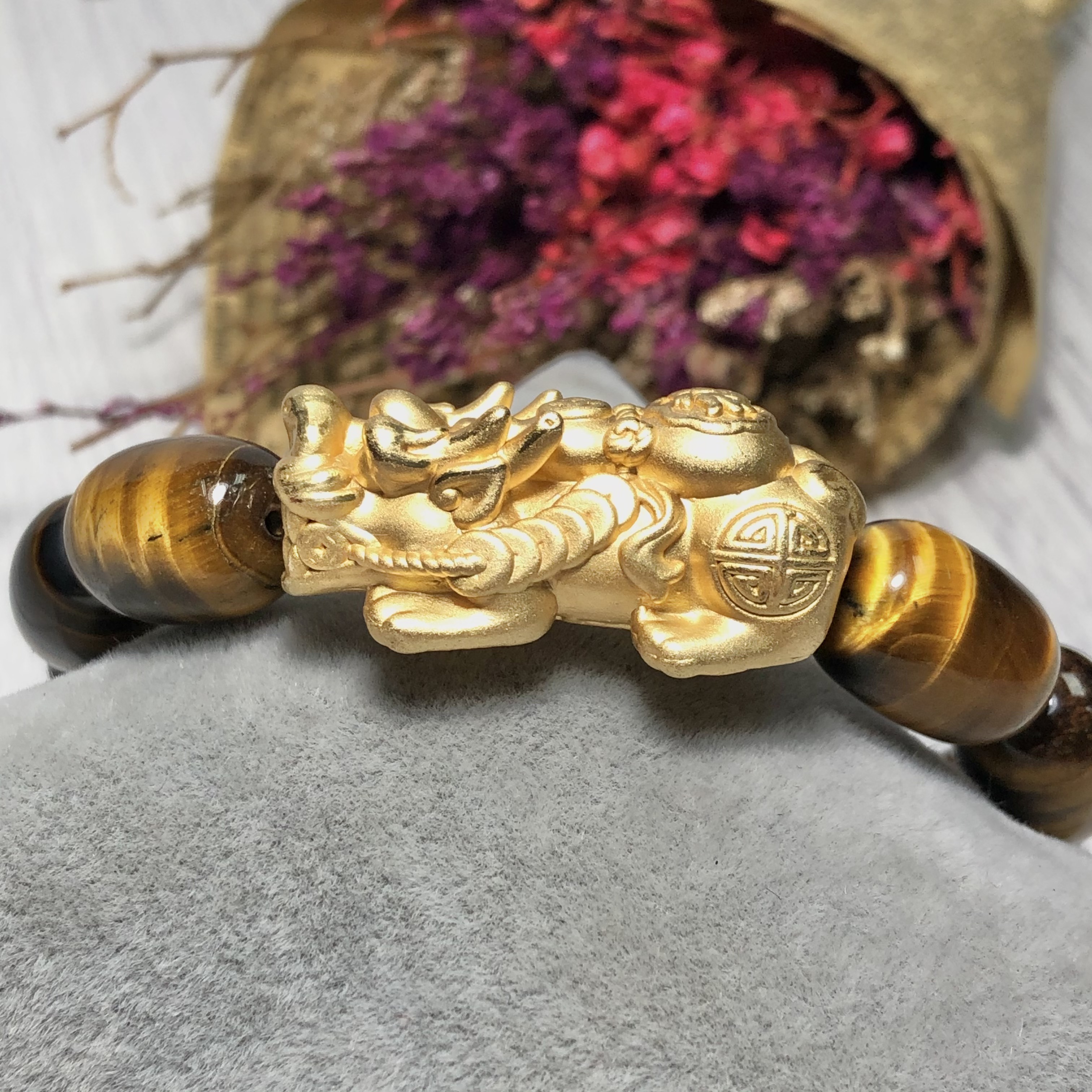 Vòng tay đá mắt hổ vàng nâu khắc hình rồng mix tỳ hưu bạc giá bao nhiêu ?