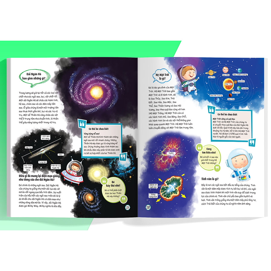 - 6 chương của cuốn sách sẽ mở ra những điều thú vị và trả lười những thắc mắc của con về: Cơ thể người, hệ mặt trời, công nghệ, khoa học, động vật, tự nhiên.