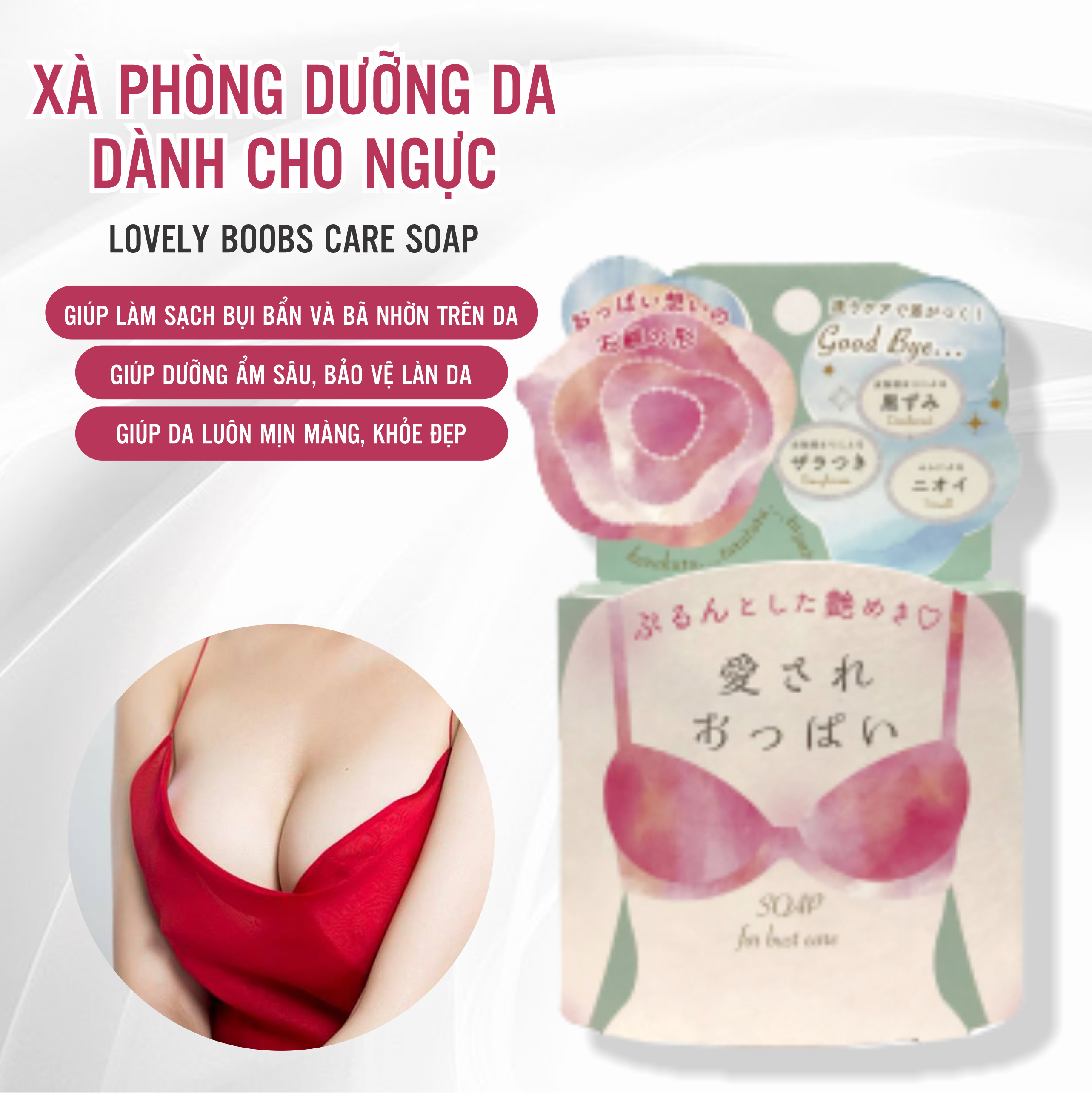 - Xà phòng dành cho da vùng ngực giúp làm sạch bụi bẩn và bã nhờn trên da, giúp dưỡng ẩm sâu, bảo vệ làn da, giúp da luôn mịn màng, khỏe đẹp 2/ Cách sử dụng :