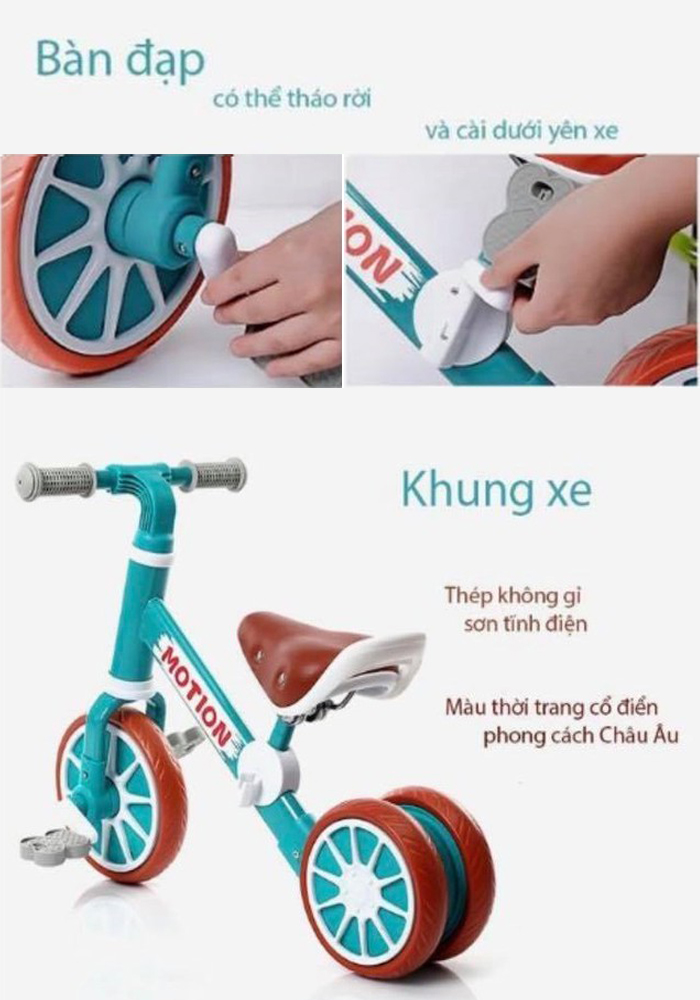 - Xe chòi chân 2 trong 1: điều đặc biệt nhất của xe có thể nói đến chính là tính năng vừa làm xe chòi chân, vừa có thể biến thành xe đạp ba bánh chỉ với 2 bước tháo và lắp đơn giản. Khi bé còn nhỏ, chúng ta gác 2 bàn đạp của xe lên vị trí đã được thiết kế sẵn dưới yên xe. Khi đó xe Motion là chòi chân 3 bánh cực kỳ đáng yêu cho bé. Xe có thể tự đứng được nên bé sẽ không sợ bị ngã, không phải tự giữ thăng bằng xe như xe cân bằng ander.Khi lắp 2 bàn đạp của xe vào bánh trước, xe trở thành xe đạp ba bánh. Với đường kính bánh trước của xe lên đến 12 inch, giúp bé đạp xe đi nhanh hơn.