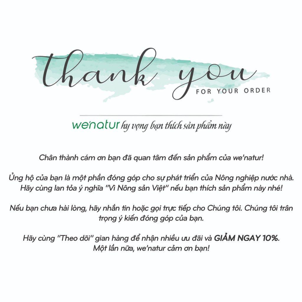 - Là món ăn vặt lành mạnh, thích hợp dùng khi đi du lịch, picnic, tụ tập gia đình, bạn bè, xem phim hoặc làm quà biếu, quà tặ HƯỚNG DẪN BẢO QUẢN Bảo quản nơi khô ráo thoáng mát (tránh ánh nắng trực tiếp), giữ kín gió sau khi sử dụng CAM KẾT we'natur với định hướng phát triển Nông nghiệp lâu dài, bền vữôn đồng hành cùng Nông dân tạo nên chuỗi cung ứng nhằm đem lại nguồn cung nguyên liệu trái cây, nông sản tươi ngon nhất, đảm bảo yêu cầu chất lượng đầu vào cũng như các tiêu chí an toàn vệ sinh thực phẩm, đảm bảo sản phẩm đến tay người tiêu dùng tự nhiên & an lành nhất!