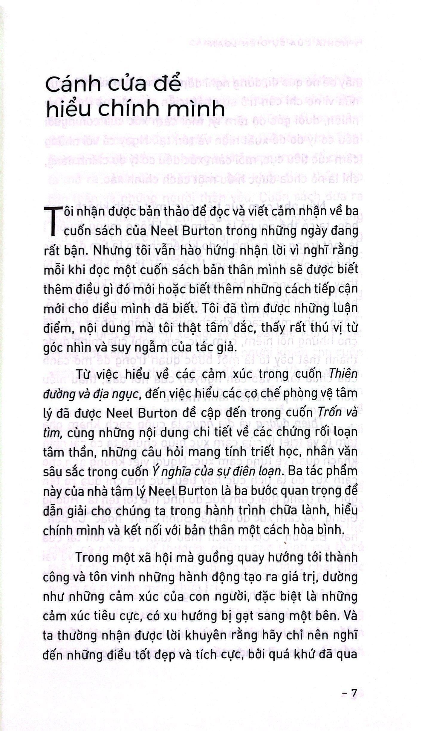 Bằng tri thức tuyệt vời và kinh nghiệm thực tế của m.ình, Neel Burton đã dẫn dắt và giúp người đọc hiểu đầy đủ về các rối loạn tâm thần theo sự phát triển từ y học nguyên thủy đến y học hiện đại, thông qua các phân tích khách quan và không thiên kiến – với lập luận và dẫn chứng cụ thể, ví dụ minh họa sinh động. Cuốn sách mang đến những góc nhìn mới khi trao đổi về các vấn đề không mới, từ đó trở nên gần gũi hơn với bạn đọc phổ thông.