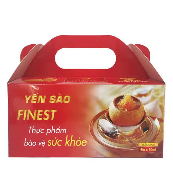 Mua tại TiktokNƯỚC YẾN CHƯNG ĐƯỜNG PHÈN FINEST_Hộp 6 quai xách ( 1 HŨ 70ML) Thành phần : Yến sào 500 mg Vitamin D3 624 iu Canxi lactate 28 mg Đường phèn 10 g Đối tượng sử dụng Người mệt mỏi, suy nhược, người cần bồi bổ sức khỏe Công dụng Hỗ trợ giúp bồi bổ sức khỏe, giúp tăng cường sức đề kháng Cách dùng Ngày uống từ 1 -2 lọ, uống trước khi ăn. Ngon hơn khi uống lạnh Bảo quản Nơi khô ráo, thoáng mát, tránh ánh sáng trực tiếp Lưu ý:Đóng kín nắp chai sau khi sử dụng.Sau khi mở nắp chai nếu không dùng hết bảo quản ngay vào tủ lạnh.