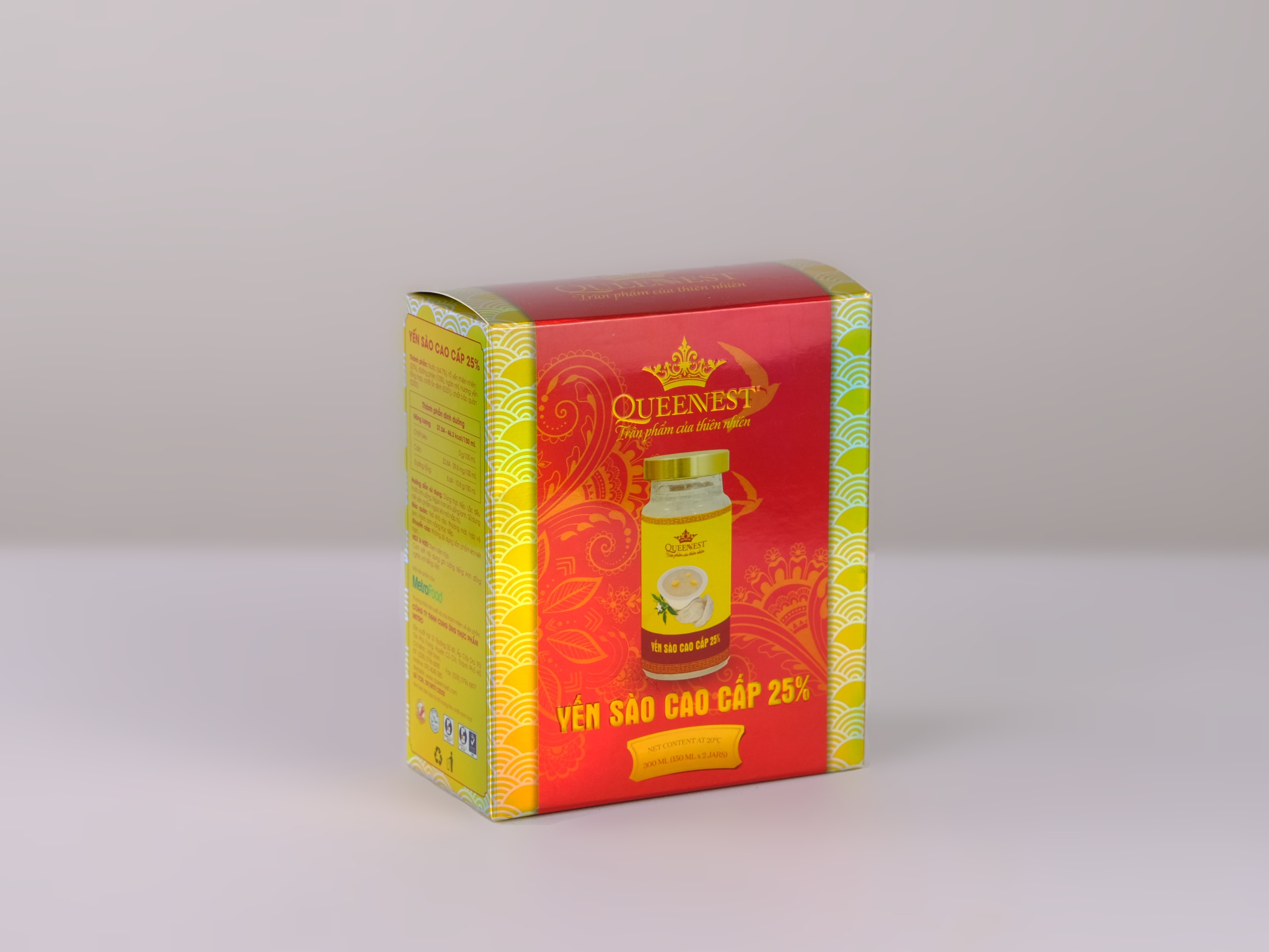 - Tên sản phẩm: YẾN SÀO CAO CẤP 25% - Thành phần: Nước (64.7%), tổ yến thiên nhiên (25%), đường phèn (10%), ngân nhĩ, hương yến tổng hợp, chất ổn định (E331), chất bảo quản