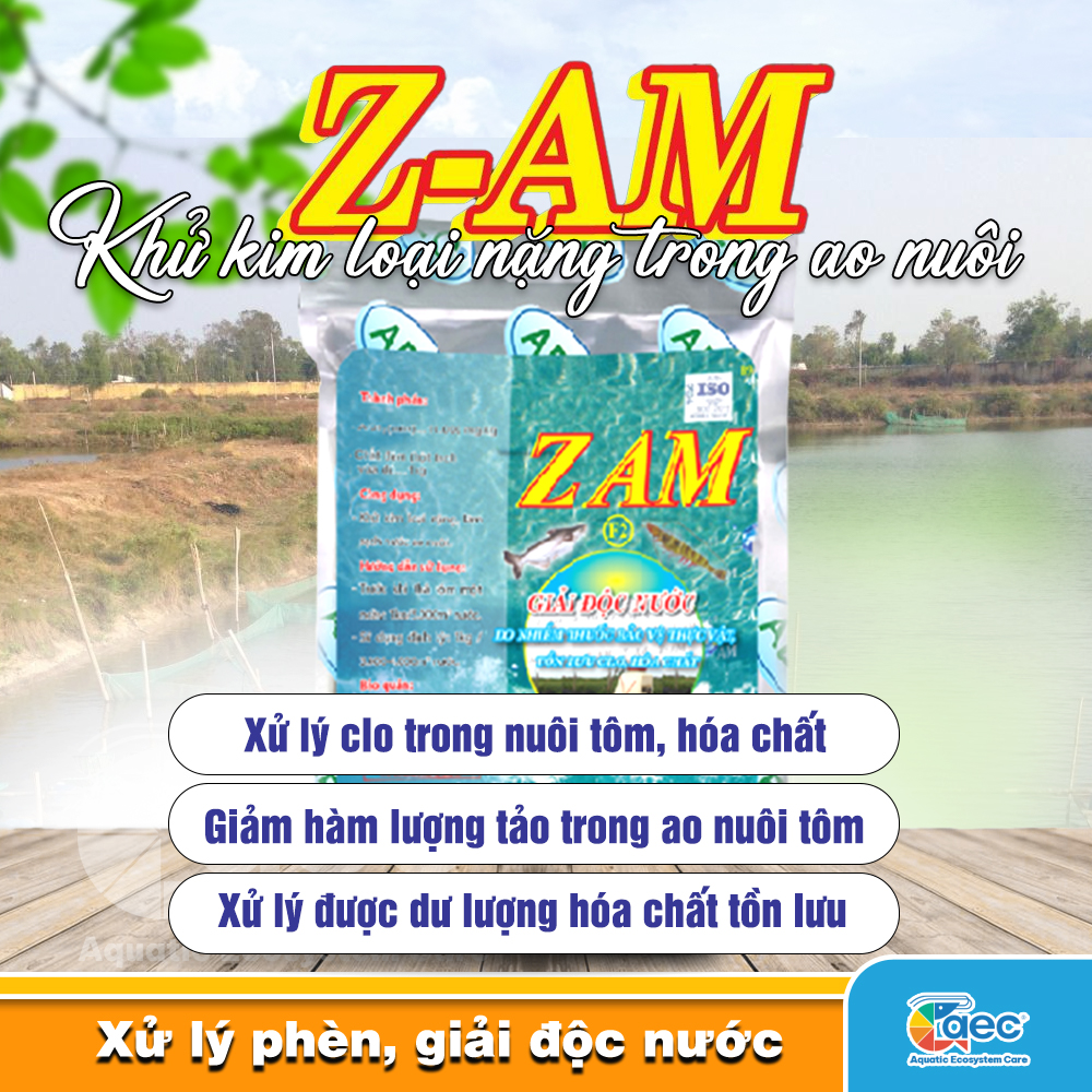 Mua tại TiktokZ-AM là chế phẩm chuyên dụng trong quy trình chăm sóc ao nuôi thủy sản. Sản phẩm giúp xử lý nước ao, giảm thiểu kim loại nặng và các chất không mong muốn, từ đó cải thiện chất lượng nước và tạo môi trường ao nuôi sạch, ổn định, giúp tôm cá phát triển tốt. Công dụng nổi bật: